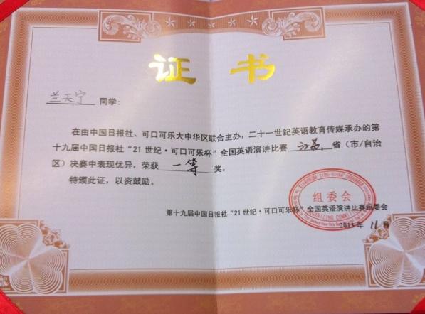 11月9日,第十九届中国日报社“21世纪•可口可乐杯”全国英语演讲比赛江苏赛区决赛在南京师范大学仙林校区举办,必赢官网2012级本科生兰天宁获得一等奖,这是近年来我校非英语专业学生在同类赛事中获得的最佳成绩!