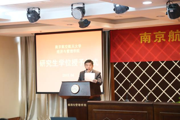 毕业典礼由学院党委副书记许静老师主持,党委书记焦宏图、院长周德群分别向获得校优秀毕业研究生、2014年国家奖学金获得者颁发了奖状。周德群院长与张卓副院长为毕业生们共同授予学位。随后,周德群院长向毕业生传达了他的殷切期望,在寄语中,周院长首先对经管学院2015届硕士研究生顺利毕业和获得硕士学位表示了由衷的祝贺。随后,他与毕业研究生分享了论语中的人生哲学:以“仕而优则学,学而优则仕”鼓励同学们珍惜时间,;以“学而不思则罔,思而不学则殆”告诫同学们学习之余要勤思考;以“见贤思齐焉,见不贤而内自省也”鼓励同学们肯定他人的优势以自我激励,认识别人的不足以自我检讨;以“知之者不如好之者,好之者不如乐之者”鼓励同学们要不断培养对待学习与工作的兴趣与动力,在人生的每一个阶段都以学习为乐事,在快乐中学习、工作。此外,周院长还与同学们分享了对于家庭幸福以及人生名利的见解,倡导同学们用真诚的心呵护家庭,用淡泊的心对待名利。最后,他对全体毕业研究生提出了“勤奋、创新、严谨和合作”四点殷切期望,希望毕业生们在今后的工作生活中继续学习,努力实践,不断充实自我。周院长热情洋溢、语重心长的讲话博得同学们阵阵热烈的掌声。
