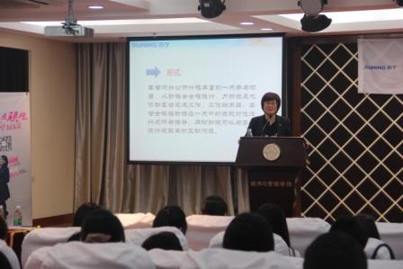 都艳艳是南航经管院工商管理专业2003届毕业生,作为凤回巢的主讲嘉宾,她进行了主题为“拥抱互联网,揭秘苏宁转型之路”的专题演讲。从苏宁的三个“十年”,到苏宁的“互联网+”转型,从“一体、两翼、三云、四端”的企业战略,到苏宁人的“守本求新”精神,同学们不仅加深了对苏宁集团的了解,也加深了对互联网营销的认知。专题演讲后,主持人邀请邹冬萍、都艳艳参加到互动沙龙中,两位嘉宾针对苏宁择人标准、企业如何以互联网思维开展运营等具体问题进行了耐心细致的解答,同学们则表达了到苏宁大舞台历练自己、发展自己的成长需求。在苏宁高管一日助理项目宣讲中,邹东萍详细介绍了该项目的背景、具体开展方式以及择人标准。