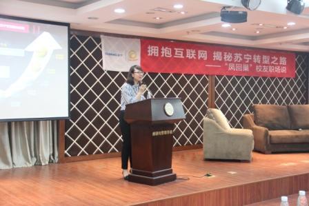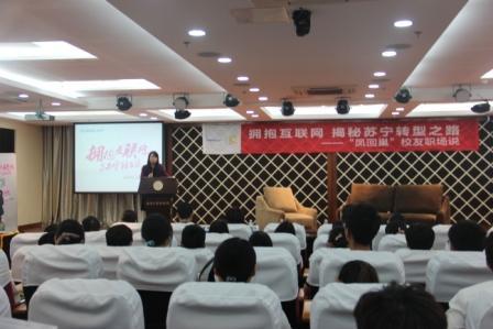 4月28号晚,必赢3003no1线路检测中心携手苏宁云商集团举办了“凤回巢”校友职场说活动,本次活动由校就业指导服务中心主办,必赢3003no1线路检测中心承办,苏宁企业俱乐部协办。苏宁云商南京大区副总经理邹冬萍、都艳艳,人力资源中心张雯莉,校就业指导服务中心主任徐俊珠,校就业指导服务中心主任指导部部长沈雪萍,经管院党委副书记许静,苏宁企业俱乐部指导老师庞依达,以及苏宁企业俱乐部成员、经管院学生代表等100余人参加了此次活动。