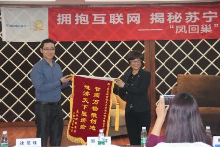 经管院党委副书记许静在致辞中,梳理了学院和苏宁在专业竞赛、实习计划等校企合作形式,表达了对邹总、都总带领的苏宁一行的欢迎,希望能与苏宁进一步开展深入合作,谋求南航与苏宁校企合作的新常态。随后苏宁云商南京大区副总经理邹冬萍向学校赠与锦旗,校就业指导服务中心主任徐俊珠代表学校参加了此环节,邹总表达了对南航的感谢。