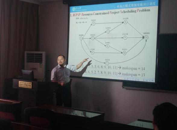 4月29日上午,刘士新教授与部分师生们进行了小范围交流,根据自身经验,介绍了钢铁企业在资源配置上存在的问题,谈及常用的项目调度问题解决方法,给出的企业案例生动有趣,且具有理论研究价值。下午刘士新教授作了题为《资源受限项目调度问题分类及优化方法》的学术报告。首先针对经典项目调度,从单执行模式资源受限项目调度问题和多执行模式资源受限项目调度问题两个方面,详细介绍了案例库的建立过程和国际上经典的寻优算法。然后针对项目调度与多技能人力资源分配问题和考虑学习效应的多技能人力资源分配等问题,提出了描述人力资源学习效应的分段线性方法,建立了问题的混合线性整数规划模型。刘士新教授的报告内容独具匠心,在座师生积极参与讨论,普遍感到启发很大,拓展了师生的学术眼界。刘士新教授对师生关心的钢铁企业中的实际运作与优化问题,也给出了精彩的解答。