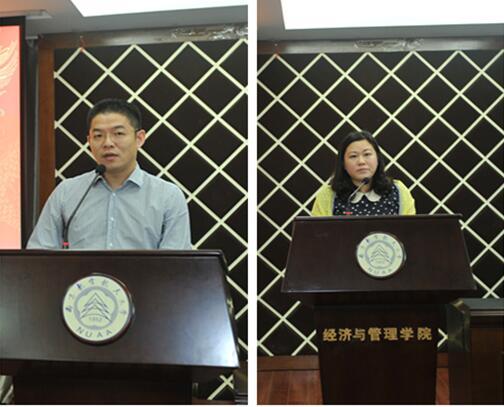接着,夫妻新生代表“金童慧女”童德、王慧分别代表新生做了发言。夫妇二人同时考取了南航MBA,演绎了学习型家庭的一段佳话,更难能可贵的是妻子王慧联考成绩还拔得了本届新生的头筹,与吴志华同学并列获得南航MBA2015年联考第一名。二人代表新生回应了周院长提出的治学要求,对于来之不易的学习机会倍感珍惜。代表新生们表态:会认真学习管理知识,将课堂所学理论充分应用到本职工作中去,最终实现理论水平和工作能力的双提高,从而有效提升个人价值;争取做到今天我以南航大为荣,明天南航大以我为骄傲,努力把自己培养成学有专攻、富有远见、高尚精明的现代职业经理人,用孜孜不倦来书写美丽的人生画卷,来感恩母校,回报母校。