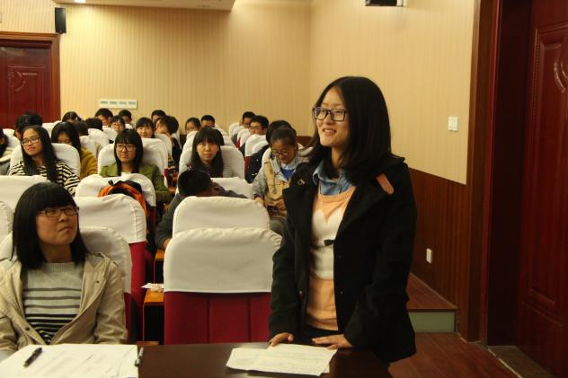 丁荣茂老师 从“中国梦”“中国魂”说起,首先指出了社会主义核心价值观是人民的灵魂。并且列举了雷锋、薄熙来等正反人物事例,从而引出了社会主义核心价值观的重要性。接着又点出青年实践社会主义核心价值观要在勤学、修德、明辨、笃实四个方面下功夫。随后,丁荣茂老师指出南航学子要做践行社会主义核心价值观的模范,做到坚定信念、创新驱动、文化引领、成才报国,成为时代精英。此外,丁老师也向大家展示与介绍了南航青年学子、校友的风采以及南航人在祖国航空航天方面的突出贡献,并且对南航人给予了极大的赞赏。最后,丁荣茂老师还重点对必赢官网的院训、愿景、使命进行分析介绍,点明其中蕴含的核心价值观,并对必赢官网学子抱以衷心的期望,用“艰苦磨练意志,勤奋造就人才”、“艰辛成就伟业,奋斗创造辉煌”赠送给在座的每一位经管学子。