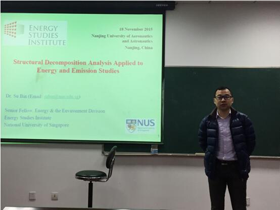 11月18日上午10点,应能源软科学研究中心所邀请,新加坡国立大学能源研究所高级研究员(Senior Fellow) 苏斌来必赢官网交流并做了主题为“Structural Decomposition Analysis Applied to Energy and Emission Studies”的专题讲座。 讲座中苏斌分析了结构分解分析和指标分解分析两种方法的区别,并介绍了结构分解分析方法在能源经济和排放研究领域的主要应用情况。专题讲座结束后,在场师生和苏斌针对目前国际能源和排放问题研究领域中结构分解分析及其他研究方法进行了讨论。 据了解,苏斌主要研究领域为能源经济与政策、能源与气候变化、能源环境系统建模和分析。现任 Energy Economics (SSCI源刊) 期刊副主编,Reports on Economics and Finance 期刊编委,以及 30 多个国际期刊审稿人,包括 Nature Climate Change, Proceedings of the National Academy of Science of the United States of America, Energy Economics, Energy Policy, Ecological Economics, Applied Energy, Economic Systems Research 等。在国际期刊 Energy Economics, Ecological Economics, Energy Policy, Energy, Applied Energy, Economic Systems Research 等上发表 20 多篇能源和环境相关的文章。目前在新加坡能源研究所主持和参与多项能源环境相关的国内和国际合作研究项目,项目报告提交至新加坡环境与水资源部、贸易与工业部、外交部、气候变化秘书处、国家研究基金会等多个政府部门。 报告结束后,师生们踊跃发言和提问,就报告内容进行了详细探讨,报告会在热烈的讨论中圆满结束。