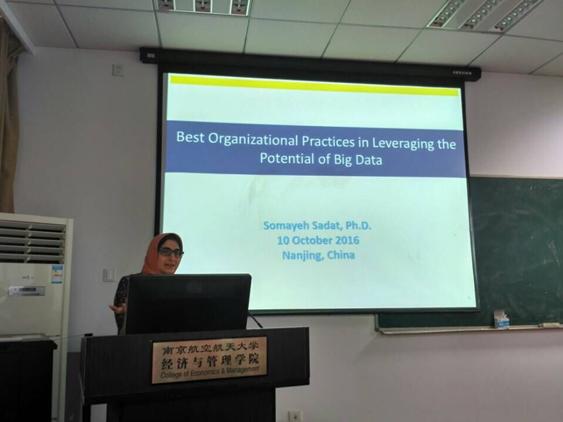 2016年10月10日下午15:00至16:00在东区必赢3003no1线路检测中心大楼704,TarbiatModares大学 的Somayeh Sadat教授受必赢官网智能决策与风险分析研究所的邀请,作了题为“Best Organizational Practices in Leveraging the Potential of Big Data”的报告。经管学院的老师以及学生积极地参加了此次报告。