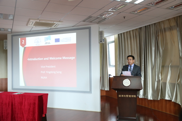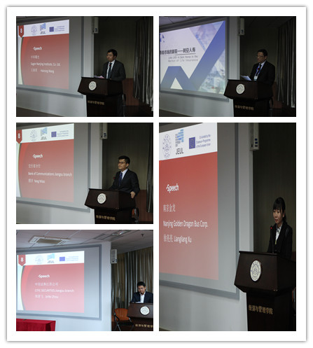 开幕式由陈锋主持。宋迎东副校长首先致开幕词欢迎与会代表,并介绍了南航的基本情况,宋校长说“希望通过此次研讨会在中国进一步加深海内外大学和企业之间的合作”。接着,周德群院长介绍了南航经管学院的发展情况及愿景使命、社会责任,意大利锡耶纳大学Maurizio Pompella教授向与会嘉宾详细介绍了JEUL项目。随后,在代表们的见证下,赖际舟副处长代表南航与利安人寿、中科曙光共同签署了“谅解备忘录”,与会代表合影留念。最后,中科曙光南京研究院有限公司总经理王海荣、利安人寿总精算师王龙根、南京金龙客车有限公司人力资源部总监徐亮亮、交通银行股份有限公司江苏省分行人力资源部总经理缪洋、中信证券江苏分公司副总经理周晋飞分别代表企业做了介绍,几家单位分别表示,后续会通过与南航共建学生实习基地、建立研究生工作站等方式加强合作与交流。