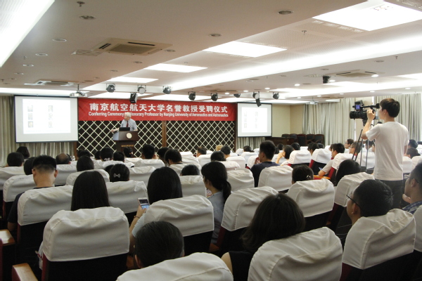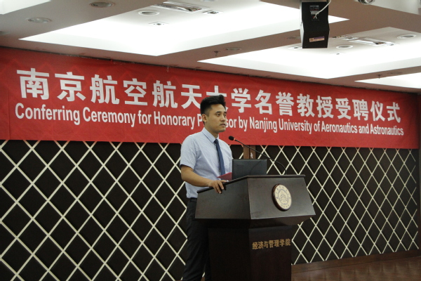许希武副校长代表学校向Roman Slowinski院士颁发聘书并佩戴了南航校徽。Roman Slowinski院士在致辞中对学校的聘任表示十分荣幸和感谢,对这次南航成功承办首次在亚洲召开的GDN国际会议表示祝贺,并对我校近年来在科学研究、人才培养和国际合作等方面取得的成就给予了高度肯定。