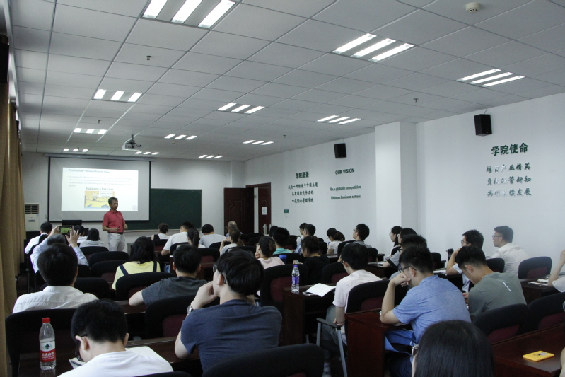陈剑教授此次讲座的主题是:基于目标驱动风险态度的投资选择。投资策略是基于买卖双方的意向,以网购书籍为例,目前网购平台有淘宝、京东、当当、亚马逊等,不同平台对同一本书的定价不同,但是定价高的平台也能维持盈利。原因在于不同平台有各自的品牌优势、价格优势、客户源优势、物流优势等,而客户选择主要基于对平台的信任程度、价格水平等,当买卖双方意向一致时,则达成买卖协议。陈剑教授提出达成投资的主要动机在于与目标最相关的因素,而与目标的相关程度难以度量,因此反向思考,提出与风险的相关程度。当某策略风险越高,则客户投资倾向越低。最后通过构建风险与收益的函数,求解出最佳投资策略。精彩纷呈的讲授,激发了在座同学与老师的热情,有同学将此次讲座内容引申到前景理论,得到了陈剑教授的认可。