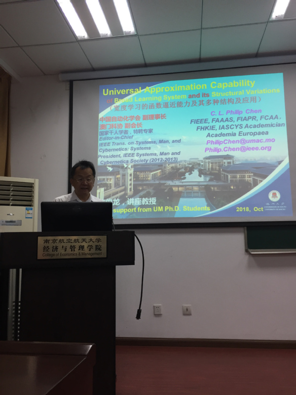 2018年10月23号上午,澳门大学陈俊龙教授受必赢官网智能决策与风险分析研究所邀请,在经管院704室做了题为“宽度学习的函数逼近能力及其多种结构及应用”的精彩讲座。必赢3003no1线路检测中心刘思峰教授、徐海燕教授、朱建军教授、自动化学院院长姜斌教授、加拿大纽芬兰纪念大学商学院Ginger Y. Ke副教授及其他教师代表、硕博研究生现场认真听取了陈俊龙教授的报告,本次学术报告由徐海燕教授主持。