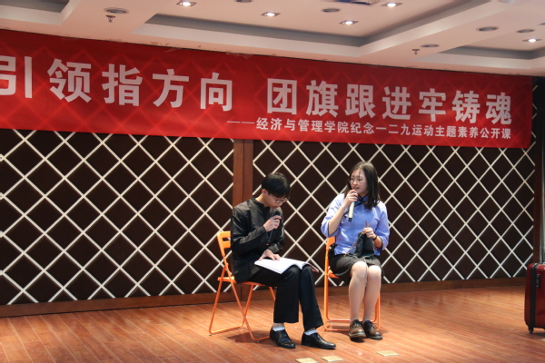 素养公开课形式新颖多样,各个环节主讲人为学院党员、入党积极分子、团学骨干等。一段红歌串烧拉开了素养公开课的序幕,《浏阳河》、《我的中国心》、《国家》,一首首红色歌曲唱出了经管学子的爱国情怀;2017级第一批入党积极分子王康宇进行了题为《十万青年十万军》的演讲,透露着几十年前青年从军的高涨士气,让人心潮澎湃;2017级学生郑雨的原创歌曲《红旗漫卷踏芳枝》,仿佛把我们带回了那段岁月:井岗之巅,旭日冉冉,红旗飘荡,中国革命正在此处生根发芽;话剧《今生无悔》展现的是航空航天工作者们的全身心投入国家建设的家国情怀;2018级团学骨干带来的多人朗诵《石在,火种是不会绝的》则突出了中国青年对祖国的责任与担当;江可申和2018级本科生张宇涵演绎的京剧《沙家浜》让我们感受到了中华传统文化里炽热的爱国热情,沉着冷静、不卑不亢的阿庆嫂让人心生敬畏;院级学生组织团学骨干们以大合唱《十送红军》、《映山红》的形式,向红军战士致敬,向千千万万为革命事业奋斗终身的爱国者们致敬。