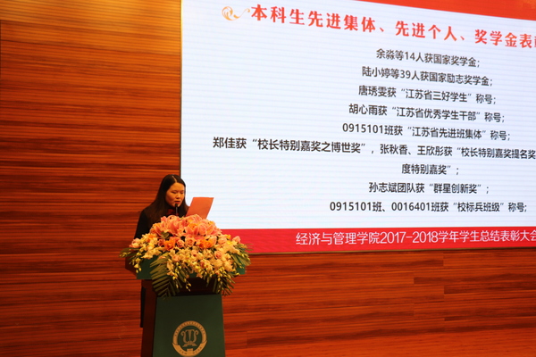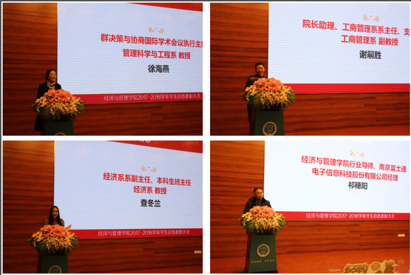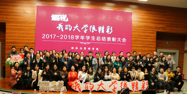 12月28日晚,“我的大学很精彩”经致青年说暨2017-2018学年必赢3003no1线路检测中心学生总结表彰大会在将军路校区主楼四楼报告厅隆重举行。学院院长周德群,学院党委书记焦宏图,校团委书记李君,副院长王英、邓晶,党委副书记涂志宏,南京富士通电子科技股份有限公司生产制造部部长祁穗阳,经管红石榴工作坊指导老师玛依拉,各系主任、副主任,团委书记,各年级辅导员以及四百余名经管学子参加此次大会。