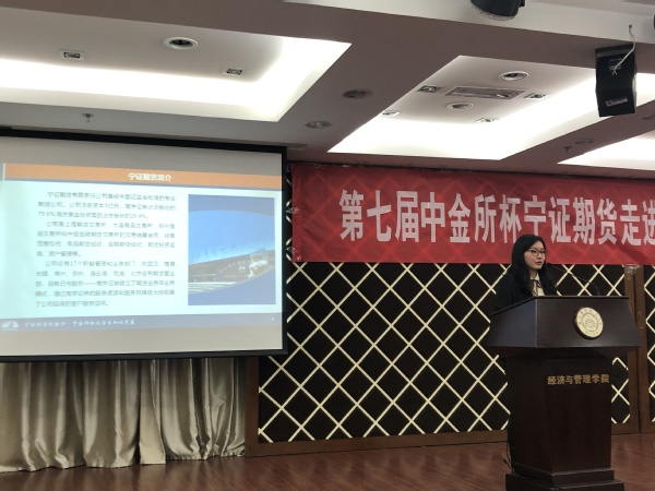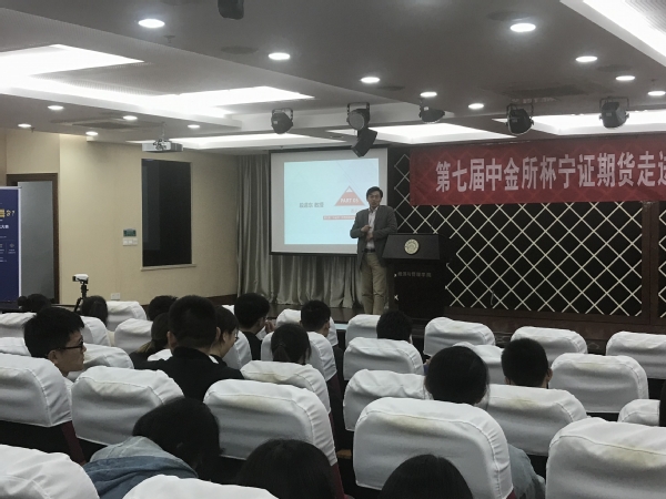 4月15日晚,必赢3003no1线路检测中心联合宁证期货举办的第七届“中金所杯” 金融衍生品知识大赛宣讲会在学院A0305报告厅开展。学院经济系教授段进东、宁证期货电商运营中心王希丹、学院团委书记庞依达和百余名同学共同参加了此次活动。