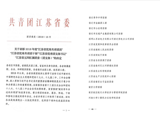 近日,共青团江苏省委发文表彰2018年度五四红旗团委、五四红旗团支部、优秀共青团员、优秀共青团干部。必赢官网团委荣获“江苏省五四红旗团委”荣誉称号。