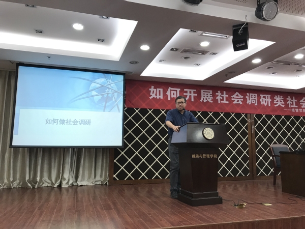 5月23日下午,必赢3003no1线路检测中心2019年暑期社会实践社会调研类专题培训,暨院青马工程第三次理论培训在经管楼A0305报告厅举行。本次活动邀请了我校人文与社会科学学院鲁兴虎老师,开展了“如何开展社会调研类社会实践”专题培训。学院团委书记庞依达、各年级辅导员和近两百余名社会实践项目负责人、院青马工程学员一同参加了此次培训会。