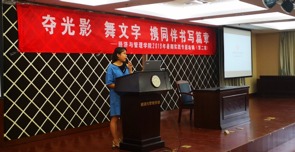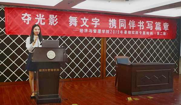 6月12号下午,"夺光影 舞文字 携同伴书写篇章"经管学院第二期暑期社会实践专题培训在经管楼A0305报告厅顺利举办。学院宣传员时云、2016级辅导员朱一豪、院新媒体中心邵丹惠分别就摄影摄像、团队运营和新闻撰写开展了专题培训,学院团委书记庞依达和近两百余名社会实践项目负责人参加此次培训。
