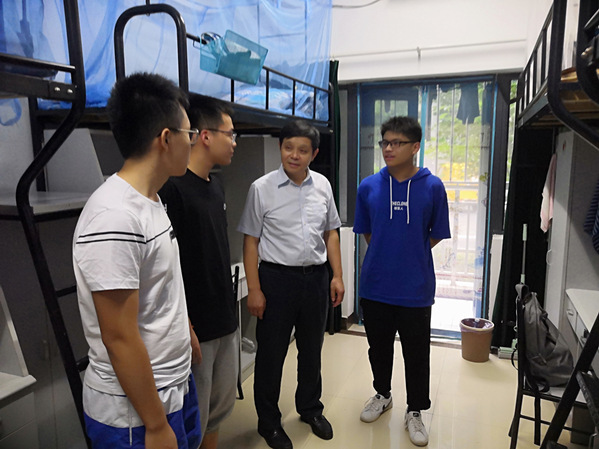 校长聂宏、校党委副书记陶勇等校领导来到学院迎新站点,亲切慰问了迎新工作人员,详细了解迎新工作安排和新生报到情况,并对学院的迎新工作表示鼓励和肯定。他们还走进学生宿舍,询问新生、新生家长来到南航的感受,关心他们的衣食住行,并勉励新生要踏实学习、历练自己,不辜负父母的期望,早日成为社会栋梁之材。聂校长亲切地与新生和家长们拉起了家常,并与同学们合影留念。