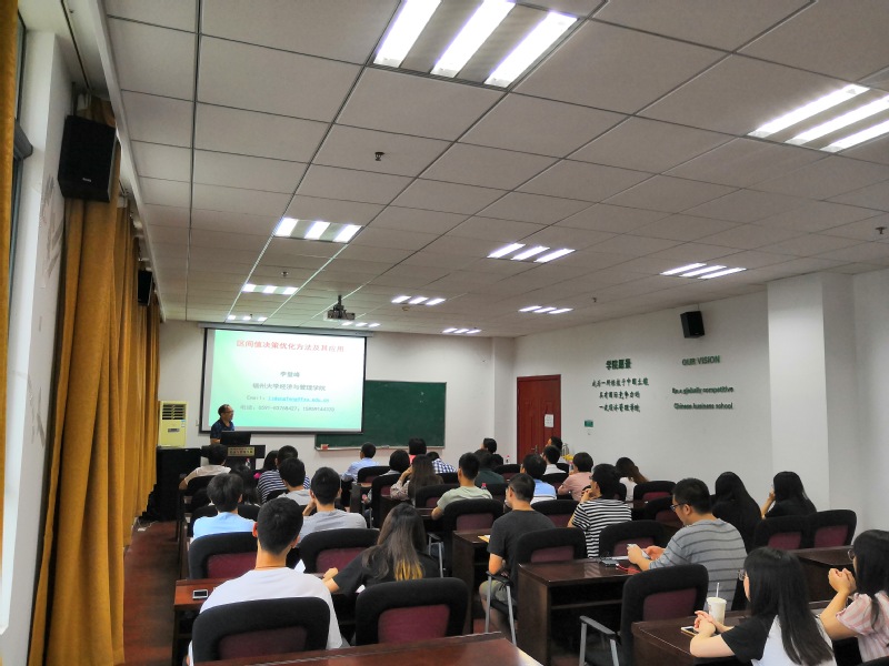 2019年9月5日上午,电子科技大学教授李登峰受学院智能决策与风险分析研究所邀请,在南航将军路校区必赢3003no1线路检测中心704作了题为“区间值决策优化及其应用”的讲座。学院教授朱建军、教授徐海燕、教授何沙玮等教师及部分硕、博研究生现场聆听了李登峰的报告,本次学术报告由徐海燕主持。