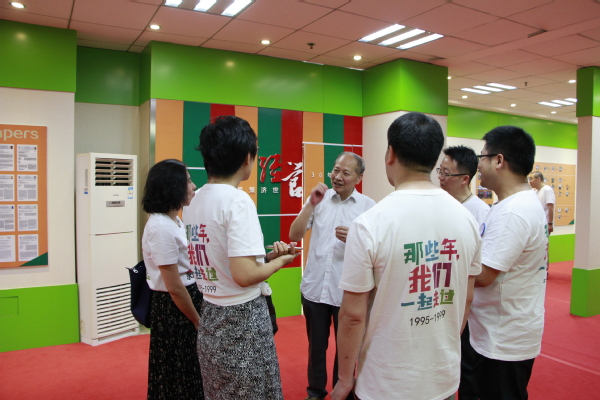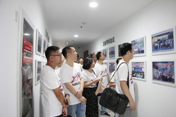 抵达后,黄炳辉、罗士礼、庞依达带校友参观了经管学院教学楼,校友们纷纷在照片墙上找寻自己的身影,往事历历在目。随后,校友们移步院史馆,围着老师听他们讲当年的故事,忆往昔,谈今朝,为经管学院二十年来的巨大变化引以为傲。