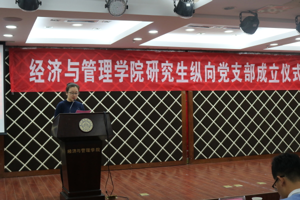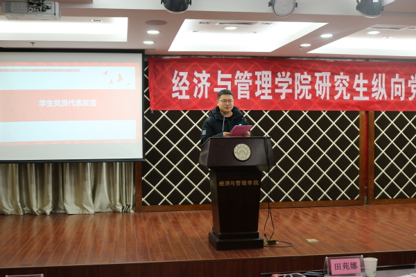 刘小杨介绍了学院研究生纵向支部工作的背景情况,在充分调研和征求意见的基础上,学生党总支将原建立在年级和班级的12个研究生党支部,按照学科、研究方向进行了纵向化设置;经过党支部与党员的双向选择,拟成立管工、工商、经济三个系部下的10个纵向研究生党支部。