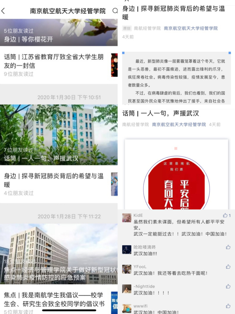关注疫情发展,积极做好防疫宣传工作。在全院师生中采取适当、有效的形式科学宣传疫情防护知识,做好防控提醒和有关防控措施的解读和引导;学生辅导员通过各类通讯手段加强对学生及其家庭成员的关心与防护指导,及时传达准确信息,正确引导学生不信谣、不传谣,维护安全稳定和谐的校园环境;通过学院公众号开展“一人一句声援武汉”祝福众筹活动,发动全院师生为武汉加油,为身在武汉、身在湖北的师生加油!