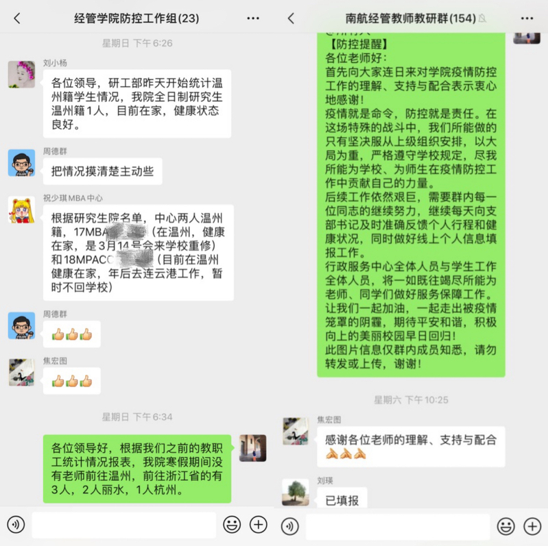 认真履职尽责,坚决落实每日值班与零报告制度。全院上下严格执行学校有关疫情防控工作部署要求,密切配合防控筛查和管理,本着守法和负责的原则,个人做好自我防护,就是对他人的负责;个人自觉做防疫情扩散的节点,就是为斩断疫情的传播链条贡献力量。学院机关每日认真做好值班工作与信息统计上报工作,通过教工党支部与学生党支部对全体在职教职工和全体全日制学生及MBA中心住校学生进行跟踪排查,对全体离退休教师逐一关心询问,建立工作台账,细致排查师生在湖北等疫情高发地区的旅居情况,使“零报告”制度有准度;对与已感染、疑似感染人员密切接触或近期到过疫源地的学生密切关注,给予关心,对于本安排提前返校的师生做好疏导工作,让防控工作有温度。