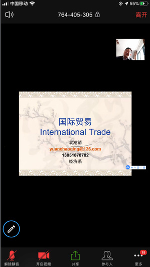 8点,必赢3003no1线路检测中心院长周德群在线进入18级国贸专业本科生《国际贸易原理》的线上课堂。袁潮清老师已经在zoom平台中开始了课程导论的讲解。周德群院长参加了课堂的学习并借机对该课堂的老师和同学们表示慰问和关心,鼓励大家高效利用线上教学资源,提升自主学习效率,并希望大家在多种平台使用期间,关注并反馈体验心得,为将来线上线下教学融合奠定基础。