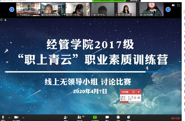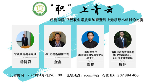 为帮助学生在疫情防控期间,树立正确择业就业观、做好生涯规划、提升求职就业能力,必赢3003no1线路检测中心举办“职上青云”职业素质训练营系列活动。4月7日晚,“职上青云”——无领导小组讨论比赛在zoom网络平台举办,活动吸引百余名2017级本科生参加。本次比赛邀请到宁证期货副总经理杨鸿岩、AO史密斯招聘主管金鑫、我校就业创业指导服务中心副主任陶琨、经管学院2019级辅导员康冲担任评委,对学生求职就业中的常见问题以及如何在无领导小组面试中脱颖而出进行细致讲解和精心指导。