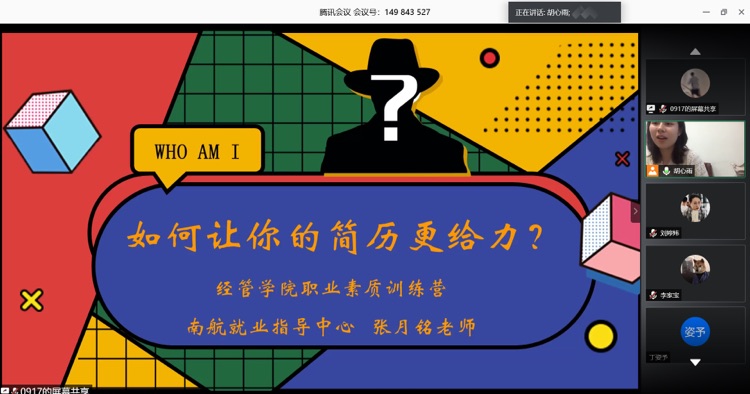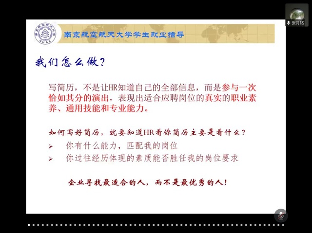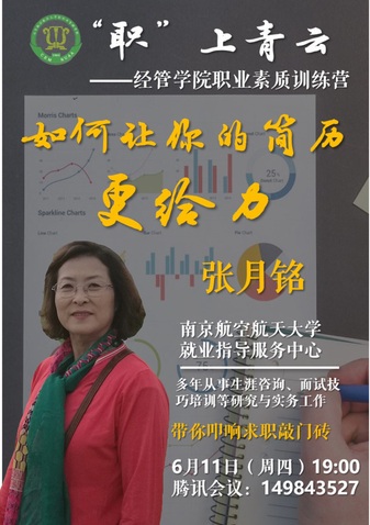 为落实学校党委关于“稳就业”的相关决策部署,切实提升学生就业竞争力,6月11日晚,必赢3003no1线路检测中心邀请南航就业创业指导服务中心张月铭老师开展“‘职’上青云:如何让你的简历更给力”线上专题讲座,辅导员胡心雨、刘婷炜以及200余名学生参加了本次活动。