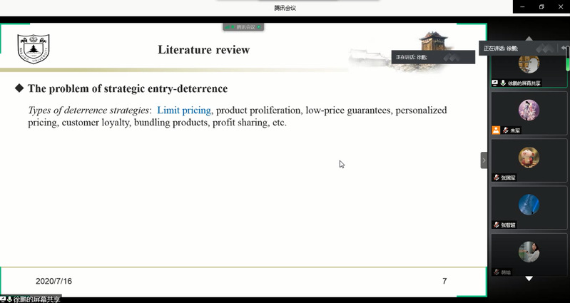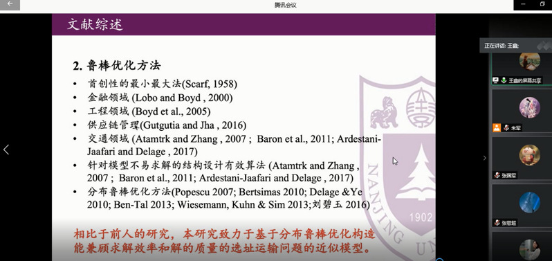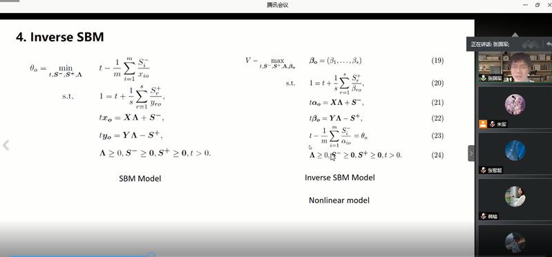 7月16日下午,青年学生张国军、王鑫、徐鹏受学院智能决策与风险分析研究所邀请,在腾讯会议分别作了题为A General Inverse DEA Model for Non-radial DEA、Target-oriented Robust Location-Transportation Problem、Pricing and entry strategies for competitive firms with managerially optimistic entrant的讲座。必赢官网教授徐海燕、谢乃明、朱建军等教师及部分硕、博研究生线上参加了张国军、王鑫、徐鹏的报告分享,本次学术报告由徐海燕主持。