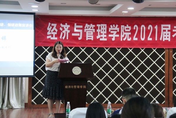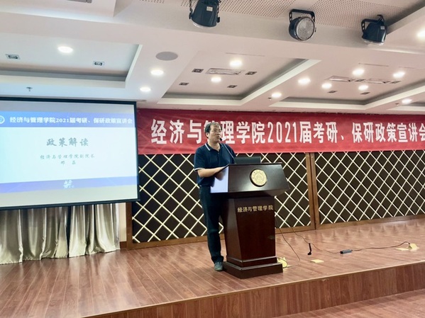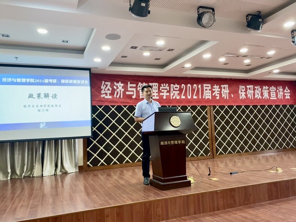 为了帮助2021届毕业生了解必赢官网研究生招生政策,合理规划考研、保研目标,提升学院生源质量,8月27日,必赢3003no1线路检测中心在A0305报告厅开展2021届考研、保研政策宣讲会。经管学院副院长邓晶、谢乃明,党委副书记涂志宏,管工系系主任马静、副主任虞先玉,工商系副主任刘文龙,经济系副主任查冬兰,辅导员及百余名2017级学生参加了本次活动。
