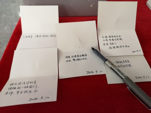 9月9日晚,必赢3003no1线路检测中心团委学生会的同学亲手为学院全体老师手写祝福贺卡,“一路桃李芬芳,永远花好月圆”“天涯海角有尽处,只有师恩无穷期”“老师,您辛苦了!”。行行真切小字,写下的是学生对老师无声的祝福;张张贺卡,折叠的是学生对老师道不尽的感激。