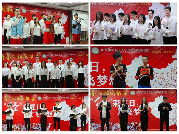 活动开场,一首由多民族学生共同演唱的《爱我中华》点燃全场热情,正式拉开了分享会的序幕。“团结战疫情,共筑爱国心”党员专项团队于5省采访抗疫人员及其家属,高举爱国主义旗帜对青少年进行主题宣讲,活动现场,他们真情演唱歌曲《逆行者》向英雄致敬。“春风行动”团队讲述了在徐州和扬州调研江苏制造业的经历,用经管人的视角和担当表达自己对于“大国工匠”和“中国制造”的看法。“格桑花开”支教团献唱歌曲《世界上唯一的花》,传递西藏支教过程中的爱与希望。“一心彝意”团队将直播间搬到现场,回顾了他们直播带货、凉山支教的经历,并在浓浓的乡音中传递助力脱贫、反哺家乡的桑梓情怀。“塞外拾萃”团队则伴着总结视频讲述了在新疆参与抗疫工作的切身感受,展现了各族人民同气连枝、风雨同舟的深厚情谊。