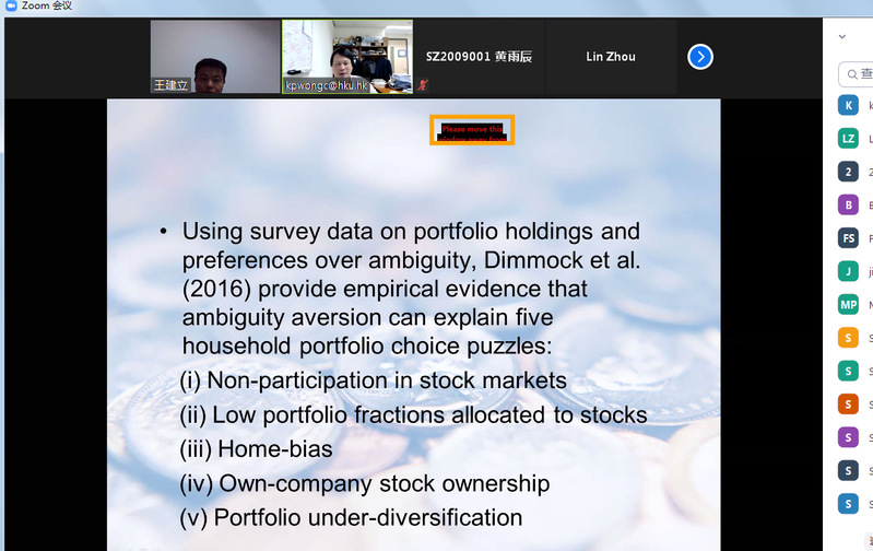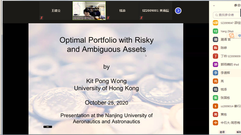 10月25日,香港大学教授Kit Pong Wong应必赢3003no1线路检测中心金融研究所邀请,在线上为我校师生作了一场题为“Optimal Portfolios with Risky and Ambiguous Assets”的精彩学术讲座。讲座由金融研究所所长王建立主持。教授袁潮清、副教授桑秀芝、陆珩瑱、苏飞等教师及部分硕、博研究生参加了本次学术交流。