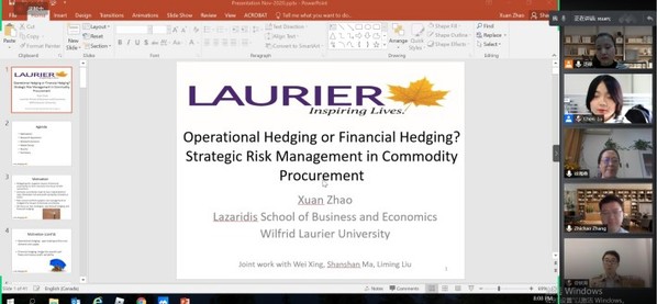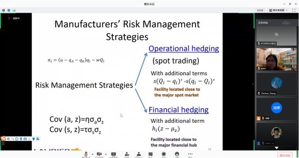 11月18日上午,加拿大威尔弗里德·劳里尔大学教授Xuan Zhao受学院智能决策与风险分析研究所邀请,在腾讯会议作了题为“Operational Hedging or Financial Hedging? Strategic Risk Management in Commodity Procurement”的讲座。必赢官网教授徐海燕等教师及部分硕、博研究生线上参加了Xuan Zhao的报告分享,本次学术报告由徐海燕主持。