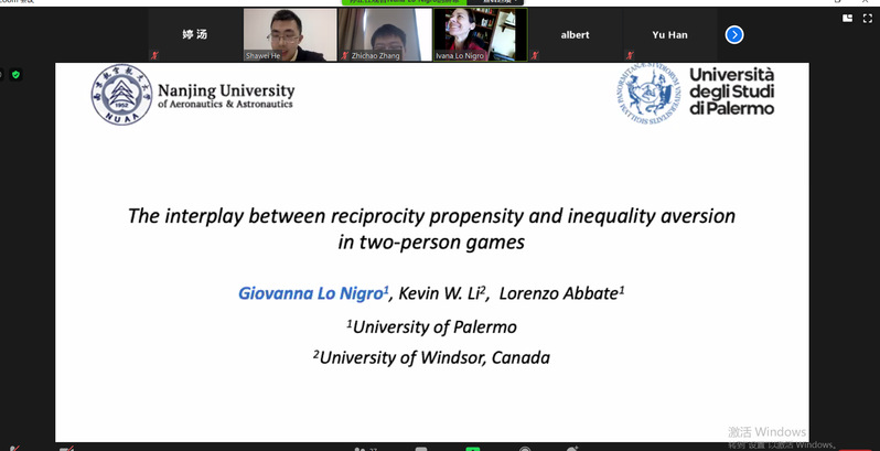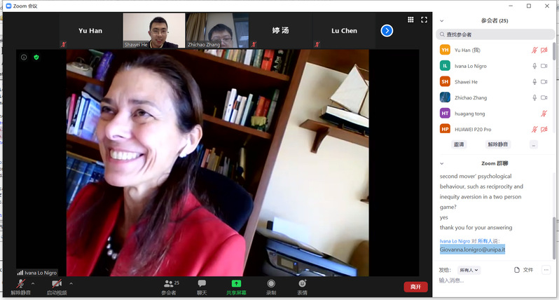 12月28日下午,意大利巴勒莫大学教授Giovanna Lo Nigro受学院智能决策与风险分析研究所邀请,在ZOOM会议作了题为“The interplay of reciprocity propensity and inequality aversion in two-person games”的学术报告。必赢官网徐海燕教授、何沙玮副教授等教师及部分硕、博研究生线上参加了Giovanna Lo Nigro的报告分享,本次学术报告由何沙玮主持。