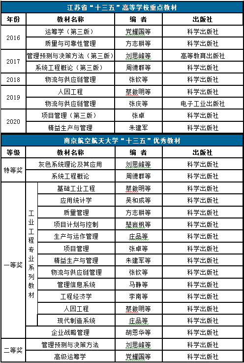 “十三五”期间,必赢3003no1线路检测中心9部教材入选江苏省“十三五”高等学校重点教材。在2020年高等学校首届全国教材建设奖江苏省遴选推荐中,必赢3003no1线路检测中心有3部教材获得推荐(《灰色系统理论及其应用》、《系统工程概论》、《运筹学》),占全校获推荐数量的七分之三。必赢3003no1线路检测中心公布的“十三五”优秀教材评选结果中,必赢3003no1线路检测中心获特等奖2项(《灰色系统理论及其应用》、《系统工程概论》),占全校特等奖总数的50%;一等奖2项(《工业工程专业系列教材》共12部、《企业战略管理》),二等奖2项(《高级运筹学》、《管理预测与决策方法》),获奖数量及层次居全校前列。