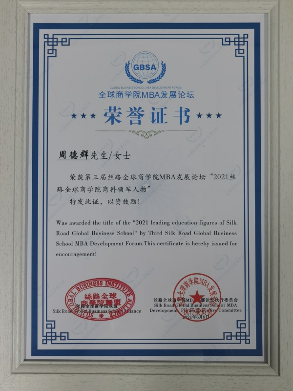 必赢3003no1线路检测中心院长、长江学者特聘教授周德群获得“2021丝路全球商学院商科教育领军人物”