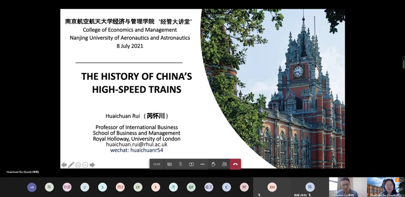 7月8日下午,英国伦敦大学皇家霍洛威学院教授Huaichuan RUI受经管学院院邀请,作了题为“The History of China's High-speed Trains”的精彩讲座,经管学院部分教师、硕博士研究生代表在线参加,副教授陆珩瑱主持本次学术报告。