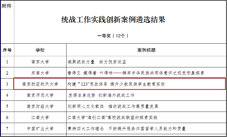 近期,江苏省委教育工委公布了“同心向党•教育有我”统战工作实践创新案例遴选结果,必赢官网党委报送的创新案例“构建123思政体系 提升少数民族学生教育实效”创新案例获一等奖(全省高校共12项)。