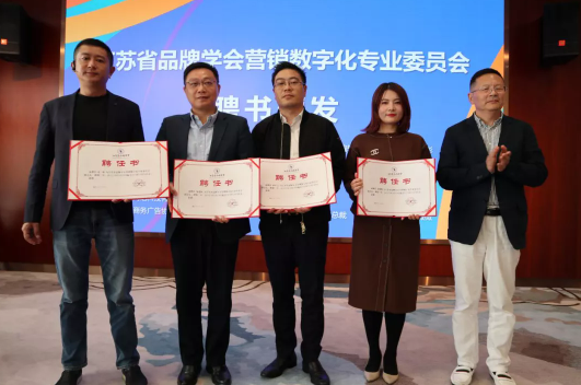 江苏省品牌学会副会长郭明全,江苏省品牌学会秘书长王国斌、以及中国商务广告协会副秘书长、虎啸奖创始人、国际品牌观察杂志社总编辑陈徐彬,为江苏省品牌学会营销数字化专业委员会揭牌。