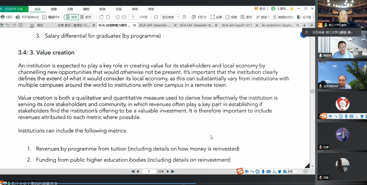 12月21日晚,国际工商管理认证协会(AMBA)中国区总负责人、浙江大学文科资深教授、浙江大学全球创业研究中心主任王重鸣教授应邀指导必赢官网BGA认证工作。因疫情防控需要,本次会议在线上召开。必赢3003no1线路检测中心院长周德群、党委书记苏州、学院副院长王子龙、邓晶、谢乃明、院长助理兼认证中心主任谢嗣胜、MBA教育中心执行主任杜刚以及相关专业老师参加会议。