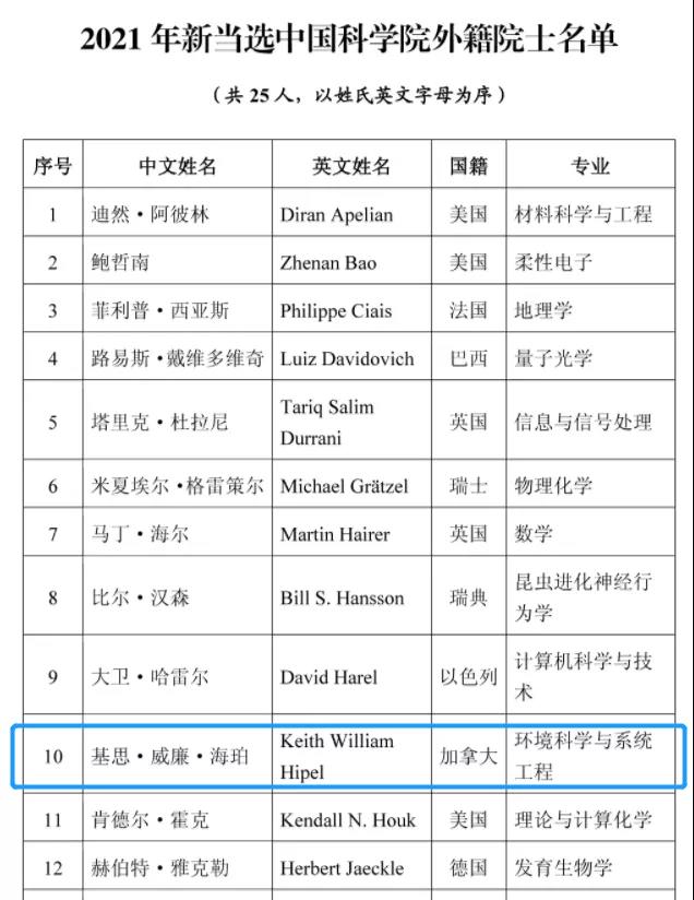 学院名誉教授基思·威廉·海珀(Keith·William·Hipel)当选中国科学院外籍院士,这是我校首位当选中国科学院外籍院士的外国专家。