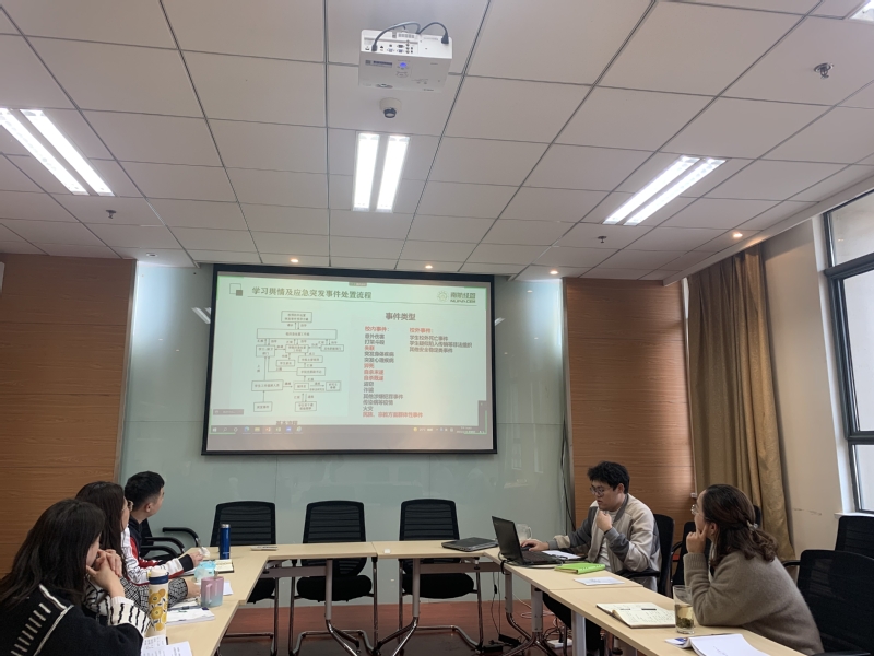 最后,与会人员围绕学生应急突发事件的预防、处置流程进行了专题学习,认真学习了学校突发事件总体应急预案,了解突发事件应急处置流程和信息报送流程,重点针对学生安全、网络舆情等常见类型突发事件的应急处置进行了交流研讨。