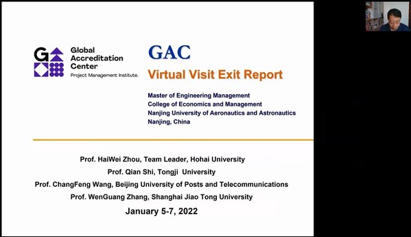 2022年1月5日-7日在经管学院举行了为期三天的现场考察评估(云端会议),现场考察评估组由河海大学周海炜教授担任组长,组员包括同济大学施骞教授、北京邮电大学王长峰教授以及上海交通大学张文光副教授。我校研究生院、经管学院的相关领导、教师及教学管理人员参加了现场考察与评估活动,党委书记苏州研究员主持仪式,研究生院副院长王英教授代表学校致欢迎辞,周德群院长介绍了学校和学院的总体情况,王子龙副院长对MEM专业硕士学位项目培养体系作了总体陈述,院长助理周志鹏就认证的具体问题向专家进行了详细汇报,相关领导与教师针对专家关心的问题一一作了回答。在为期三天的考察评估中,专家组通过云端会议翻阅查看了课程教学大纲、毕业论文、试卷及学生作业等项目资料,从多维度考察MEM专业硕士学位项目的核心教学内容与教学效果,通过在线方式与教师代表、学生代表、校友代表、教学管理人员代表以及用人单位代表分别进行了深入访谈,从多视角系统了解MEM专业硕士学位项目教育教学情况、办学特色和学员、雇主满意度。在现场考察评估意见反馈阶段,专家组对必赢官网MEM专业硕士学位项目的培养体系、教学管理模式和培养质量给予了高度评价,并一致推荐南航MEM专业硕士学位项目通过PMI-GAC认证。针对反馈意见,周德群院长、苏州书记分别做了表态发言,对考察评估专家组严谨细致的工作和提出的中肯意见表示衷心感谢,并表示将以此次认证为契机,进一步提升MEM专业硕士学位项目办学质量,为我国工程管理实践和航空航天领域的高端技术管理人才培养做出更大贡献。
