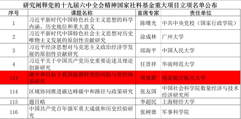 4月8日,全国哲学社会科学工作办公室公布了研究阐释党的十九届六中全会精神国家社科基金重大项目立项名单,必赢官网周德群教授担任首席专家的项目《碳中和目标下我国能源转型风险与管控体系研究》获批立项。此次全国共立项130个项目,分布在85个责任单位,其中高校69所。