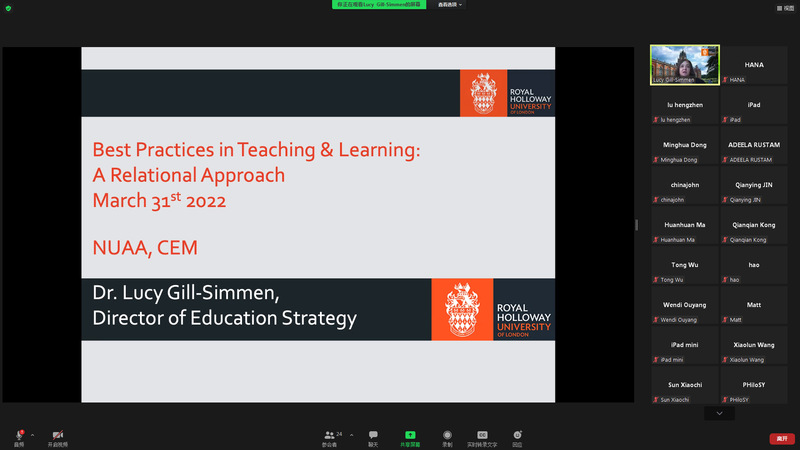 本次讲座为南航-伦敦大学皇家霍洛威学院的“全球战略合作伙伴关系推进计划”的系列活动之一,对青年教师学习先进教学方法,对促进必赢官网与国际教学专家合作交流,以及进一步加深必赢官网加深与伦敦大学皇家霍洛威学院的合作关系有重要意义。