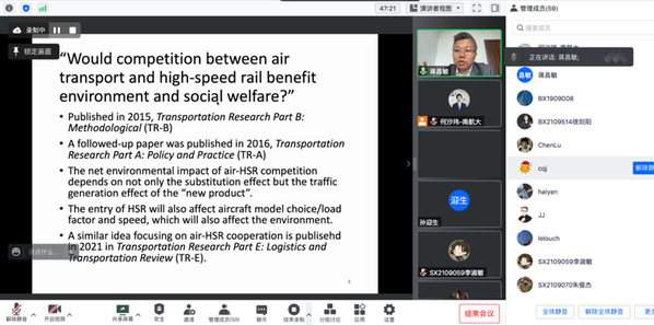 蒋昌敏首先向参会的老师、研究生介绍了关于民航碳减排技术与政策路径的经济学分析常用的方法理论。其次,回顾其在相关领域所做的工作,包括分析民航与高铁的竞争与合作关系,并分享了在空铁竞争是否有利于环境和社会福利方面取得的研究成果—民航-高铁竞争的净环境影响不仅取决于替代效应,还取决于“新产品”的交通生成效应。