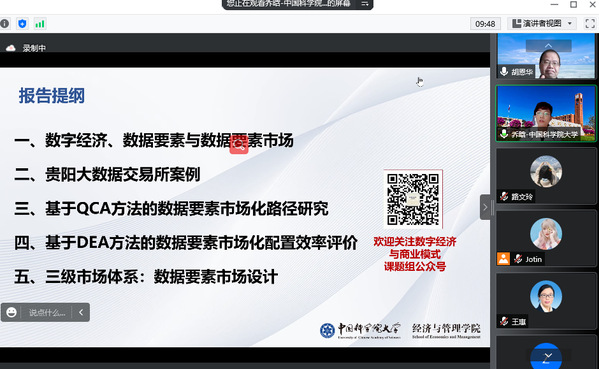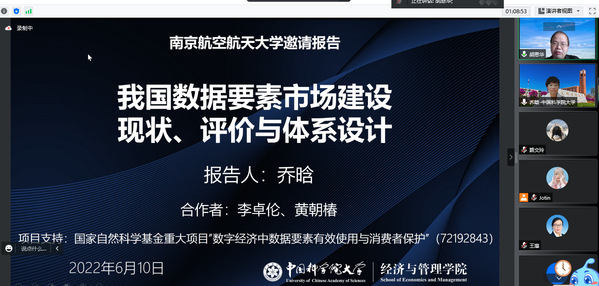 6月10日,中国科学院大学必赢3003no1线路检测中心教授乔晗应必赢3003no1线路检测中心人力资源管理研究所和江苏省人力资源发展研究基地的邀请,在线上(腾讯会议地址:996560802)为必赢官网师生作了题为“我国数据要素市场建设现状、评价与体系设计”的精彩学术报告。本次报告由教授胡恩华主持,教师李媛、何昌清、蔡静雯以及博士生和硕士生参加了此次学术报告活动。