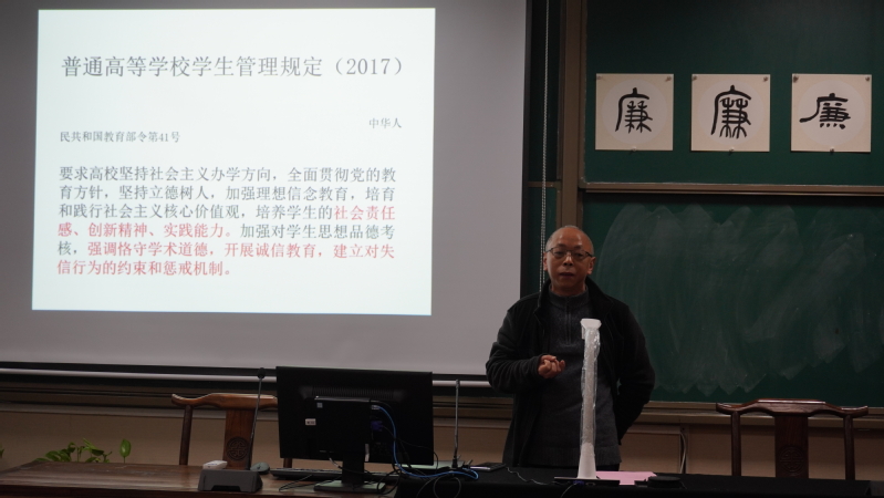 接着,马道全结合自身分管研究生教学工作的经历,围绕学术诚信讲解廉洁文化,带领大家进一步学习了解校园规章制度以及最新政策文件,指出要狠抓落实法律法规,务求实效,坚守学术诚信。鼓励青年大学生将诚信贯穿于学习、生活和实践过程中,让诚信成为我们日常生活中的自觉行为,坚持走正道,就能为全社会的廉洁文化建设做出自己的贡献。